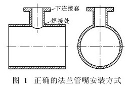 在管道開(kāi)孔安裝取壓短管時(shí),焊接取壓短管應(yīng)注意垂直方向,要求焊接后短管軸線與管道軸線夾角為90b,且法蘭短管連接的延長(zhǎng)線垂直通過(guò)管道橫截面的圓心,這樣能保證流體與磁場(chǎng)垂直,見(jiàn)圖1