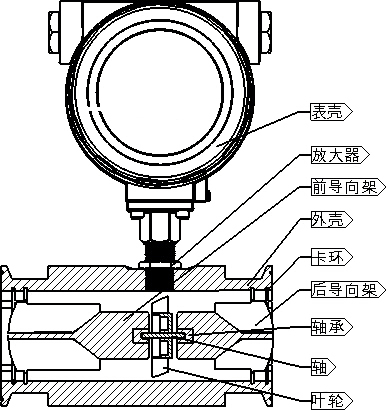 圖所示為渦輪流量傳感器結(jié)構(gòu)簡(jiǎn)圖,由圖可見,當(dāng)被測(cè)流體流過傳感器時(shí),在流體作用下,葉輪受力旋轉(zhuǎn),其轉(zhuǎn)速與管道平均流速成正比,葉輪的轉(zhuǎn)動(dòng)周期地改變磁電轉(zhuǎn)換器的磁阻值。檢測(cè)線圈中的磁通隨之發(fā)生周期性變化,產(chǎn)生周期性的感應(yīng)電勢(shì),即電脈沖信號(hào),經(jīng)放大器放大后,送至顯示儀表顯示。