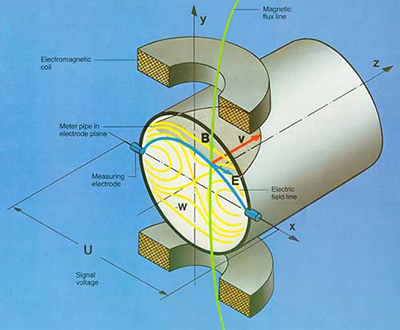 電磁流量計(jì)測(cè)量原理是基于法拉*電磁感應(yīng)規(guī)律。流量計(jì)的測(cè)量管是一內(nèi)襯絕緣材料的非導(dǎo)磁合金短管。兩只電*沿管徑方向穿通管壁固定在測(cè)量管上。其電*頭于襯里內(nèi)表面基本齊平。勵(lì)磁線(xiàn)圈由雙向方波脈沖勵(lì)磁時(shí),將在與測(cè)量管軸線(xiàn)垂直的方向上產(chǎn)生一磁通量密度為B的工作磁場(chǎng)。此時(shí),如果具有一定電導(dǎo)率的流體流經(jīng)測(cè)量管,將切割磁力線(xiàn)感應(yīng)出電動(dòng)勢(shì)E。電動(dòng)勢(shì)E正比于磁通量密度B,測(cè)量管內(nèi)徑d與平均流速 的乘積、電動(dòng)勢(shì)E(流量信號(hào))由電*檢出并通過(guò)電纜送至轉(zhuǎn)換器。轉(zhuǎn)換器將流量信號(hào)放大處理后,可顯示流體流量,并能輸出脈沖,模擬電流信號(hào),用于流量的測(cè)量和控制。