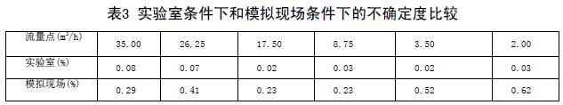 實驗室條件下和模擬現(xiàn)場條件下的不確定度比較(表3)兩次結果可以看出,兩次實驗各個流量點的不確定度差距非常大。可見,水煤漿計量表對安裝條件還是比較苛刻的。