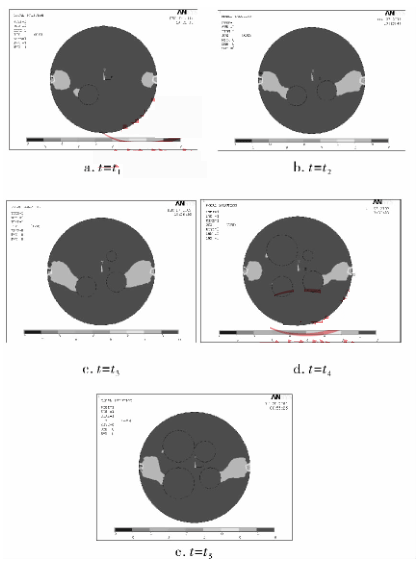 筆者探討在一體式電磁流量計徑向截面位置開始出現(xiàn)油氣泡時一體式電磁流量計感應(yīng)信號的響應(yīng)情況。在仿真模型中,設(shè)定這樣一個過程,在連續(xù)時刻 t 1 、t 2 、t 3 、t 4 ,流量計電*位置的徑向截面上分別開始出現(xiàn)一個油氣泡(非導(dǎo)電物質(zhì)),在 t 5 時刻出現(xiàn)的4 個油氣泡的半徑變大。在這一過程中,研究非導(dǎo)電物質(zhì)(油氣泡)的增加與變化對流量計輸出信號的影響情況;這一過程中,流體中的含水率也在變化,同時研究含水率對流量計的影響情況。圖 1 所示為流量計截面中油氣泡(非導(dǎo)電物質(zhì))增加與變化時的 Ansys 仿真圖,圖 1a ~ e 中分別顯示的是 t 1 ~ t 5 時刻虛電流 x 方向分量的 An-sys 圖。