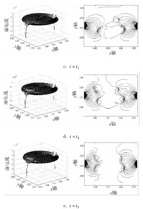 對 Ansys 仿真實驗數(shù)據(jù)通過 Matlab 進行結(jié)果分析。圖 2a ~ e 分別為 t 1 ~ t 5 時刻流體中存在油氣泡流量計測量區(qū)域虛電流在 x 方向上的分布圖及其等勢圖。從圖中可以看出:當流體中油氣泡增加時,流量計測量區(qū)域的敏感場發(fā)生變化,且流體中油氣泡越多,對流量計測量區(qū)域敏感場影響越大。為了更客觀地反應(yīng)這種現(xiàn)象,下面運用敏感場靈敏度 c 進一步進行研究。