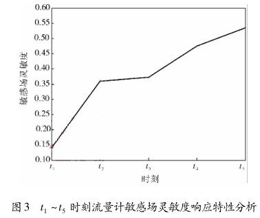 為了清晰地獲得以上 5 種情況下油氣泡對流量計虛電流分布的影響,運用敏感場靈敏度來刻畫非導(dǎo)電物質(zhì)在不同情況下對流量計敏感場靈敏度的響應(yīng)特性。圖 3 所示為以上 5 種多個非導(dǎo)電物質(zhì)存在情況對流量計敏感場靈敏度響應(yīng)特性分析。從圖3中可以看出,隨著非導(dǎo)電物質(zhì)的個數(shù)在流體中的增加,流量計敏感場靈敏度也不斷增加,說明對一體式電磁流量計的輸出信號的影響也越大。圖 3 中 t 3 時刻敏感場靈敏度 c 較 t 2時刻增加較小,這是 t 3 時刻增加的油氣泡較小,而在 t 1 ~ t 5時刻增加的油氣泡較大時,流量計敏感場靈敏度 c變化較大,說明流體中出現(xiàn)較大的油氣泡對流量計測量影響較大。