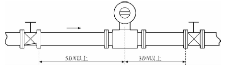 補(bǔ)水流量計的安裝質(zhì)量對其測量結(jié)果的影響較大,因此在安裝時需要注意幾個問題。*先,補(bǔ)水流量計直管段的選擇在配管時一定要按照要求進(jìn)行選擇,一般選擇流量計通徑與工藝管道通徑相同,即可滿足工程需要,而且安裝方便、壓力損失小,流量計直管段上游側(cè)的長度不少于5倍工藝管道直徑,下游側(cè)的長度不少于3倍工藝管道直徑(圖2)。但在流速太慢而又要求精度較高或需要變徑的應(yīng)用場合,可選擇通徑小于工藝管道通徑的流量計,以提高測量精度,此時流量計上、下游必須加裝異徑管,且進(jìn)口異徑管上游側(cè)應(yīng)有長于10倍工藝管道直徑的直管段,下游側(cè)應(yīng)有長于5倍工藝管道直徑的直管段(圖3)。