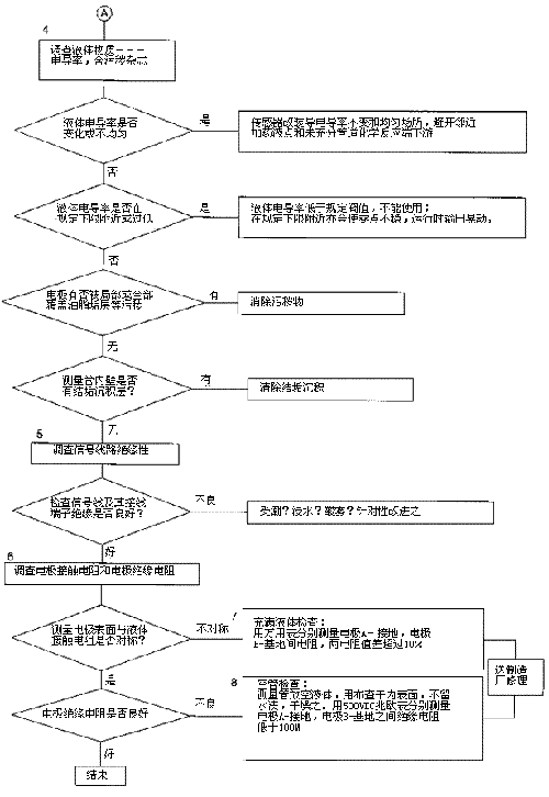 檢查流程圖*5項(xiàng)。信號回路絕緣下降會形成零點(diǎn)不穩(wěn)。信號回路絕緣下降的土要原因足,包*部位絕緣下降所引起的,但也不能排除信號電纜及其接線端子絕緣下降或破壞。因?yàn)橛袝r(shí)候現(xiàn)場環(huán)境十分嚴(yán)酷,稍一疏忽儀表蓋、導(dǎo)線連接處密封不慎,彌漫著潮氣酸霧或粉粒塵埃侵入儀表接線盒或電纜保護(hù)層,使絕緣卜降。信號回路絕緣電阻檢查分別按電纜側(cè)和流量傳感器側(cè)兩郵分進(jìn)行,用兆歐表測試。因信號電纜容易可先做。流量傳感器再分兩次進(jìn)行:充滿液體測黽電*表面接觸電阻和個(gè)管后測量,U*絕緣電阻。