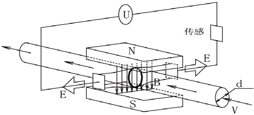如圖,測量流量時,流體流過垂直于流動方向的磁場,導(dǎo)電性流體的流動感應(yīng)出一個與平均流速成正比的電勢。其感應(yīng)電壓信號通過兩個電*檢出,并通過電纜傳送至轉(zhuǎn)換器,經(jīng)過信號處理及相關(guān)運算后,將累計流量和瞬時流量顯示在轉(zhuǎn)換器的顯示屏上。
