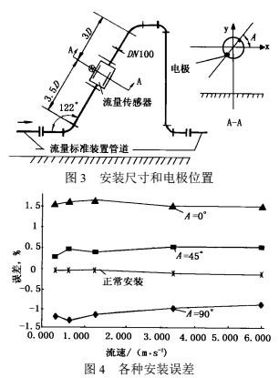 除儀表前直管段可降低彎管影響外,人們還從安裝方式上設(shè)法降低影響的方法。文獻(xiàn)曾報(bào)道電磁流量傳感器電*軸線與鄰近彎管平面成45°傾斜安裝可以減少彎管影響。日本工業(yè)標(biāo)準(zhǔn)B7554“解說部分”列有電*軸線與彎管平面垂直、平行、成45°三種安裝方式,在不同長度直管下的測量誤差范圍,也說明這一效果。