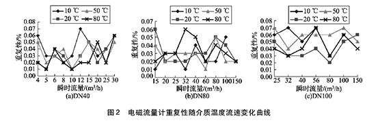 將實(shí)驗(yàn)測(cè)得的水泥計(jì)量表在不同溫度及流速下的重復(fù)性數(shù)據(jù)整理,特性曲線如圖2所示,3組曲線分別對(duì)應(yīng)DN40, DN80, DN100的3塊水泥計(jì)量表的重復(fù)性曲線。