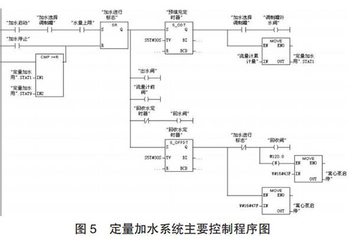 定量加水系統(tǒng)的工作過程為:當設(shè)定好加水量后,啟動系統(tǒng),多級離心泵 10、回流閥 4、出水閥 9 和流量計前閥 12開啟對管路進行預(yù)填充;延時 30s 預(yù)填充完成后,回流閥 4關(guān)閉,調(diào)制罐補水閥 14 開啟,同時質(zhì)量流量計 13 開始計量;當質(zhì)量流量計的累積量與設(shè)定加水量一致時,出水閥 9 和調(diào)制罐補水閥 14 關(guān)閉;調(diào)制罐定量加水完成后,開啟回收閥17 和回流閥 4 以及同未關(guān)閉流量計前閥 12 一起,利用壓縮空氣對管道中水實現(xiàn)回收;延時 30s 水回收完成后,關(guān)閉多級離心泵、球閥 4、12 和 17,定量加水過程完成。定量加水系統(tǒng)主要控制程序如圖 5 所示。