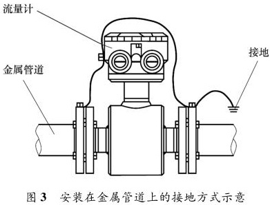 一體式污水流量表安裝在金屬管道上,安裝時將金屬管道與一體式污水流量表相連接,接地線再接入接地網(wǎng),如圖 3 所示。