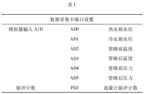 數(shù)據(jù)采集系統(tǒng)由工控機(jī)、熱水流量計(jì)以及數(shù)據(jù)采集卡組成。 4000 次冷熱沖擊試驗(yàn)要求在在*大流量 qs 條件下運(yùn)行,對(duì)流量數(shù)據(jù)的采集用到熱水流量計(jì)及數(shù)據(jù)采集卡。熱水流量計(jì)采集管路流量,數(shù)據(jù)采集卡將熱水流量計(jì)采集到的數(shù)據(jù)反饋給工控機(jī)系統(tǒng)。過程中,試驗(yàn)管路水溫以及水箱水位的采集控制也是通過數(shù)據(jù)采集卡反饋給系統(tǒng)控制。試驗(yàn)過程用到的數(shù)據(jù)采集卡采用研華生產(chǎn)的PCI - 1711。PCI - 1711 是一款多功能 PCI 總線數(shù)據(jù)采集卡,具有 16 路單端模擬量輸入功能、2 路 12位模擬量輸出功能、16 路數(shù)字輸入和 16 路數(shù)字輸出功能、計(jì)數(shù)器功能等。為保證冷熱沖擊試驗(yàn)結(jié)果的準(zhǔn)確性,嚴(yán)要求嚴(yán)格控制管路流量以及管路壓力。因此,管路設(shè)置前后管路溫度、冷熱水箱水位以及管路壓力的采集,管路流量根據(jù)熱水流量計(jì)脈沖計(jì)數(shù)進(jìn)行采集,其數(shù)據(jù)采集卡端口設(shè)置如表 1 所示。