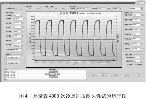 本文研究的 4000 次冷熱沖擊試驗(yàn)的實(shí)現(xiàn)具有以下特點(diǎn): (1)基于“工控機(jī) +水泵 + 熱水流量計(jì)”的閉環(huán)控制系統(tǒng),實(shí)現(xiàn)了流量自動(dòng)反饋調(diào)節(jié),滿足試驗(yàn)要求; (2)通過四個(gè)開關(guān)閥的時(shí)序切換,自動(dòng)控制試驗(yàn)溫度,很好的完成了 4000 次溫度沖擊試驗(yàn); (3)通過“工控機(jī) + 數(shù)據(jù)數(shù)據(jù)采集卡”的數(shù)據(jù)采集系統(tǒng),實(shí)時(shí)監(jiān)控試驗(yàn)過程中的流量、溫度、壓力等相關(guān)參數(shù),實(shí)現(xiàn)試驗(yàn)方式的自動(dòng)控制,并能對(duì)試驗(yàn)數(shù)據(jù)進(jìn)行分析與評(píng)定。 (4)試驗(yàn)的全過程為智能自動(dòng)化,可無人員留守看護(hù)。試驗(yàn)結(jié)果可直接反映出熱量表在長(zhǎng)時(shí)間運(yùn)行后的可靠性。為我國(guó)熱量表耐久性試驗(yàn)研究提供檢測(cè)手段,為促進(jìn)產(chǎn)品質(zhì)量提升做好技術(shù)保障。