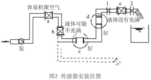 液體流動(dòng)方向必須與傳感器殼體上箭頭方向一致。對(duì)于能正反向測(cè)量的廢水流量表,若方向不一致雖仍可測(cè)量,但設(shè)定的顯示流動(dòng)正反方向不符,必須改正之。若拆傳感器工作量大,也可改變傳感器上箭頭方向和重新設(shè)定顯示儀表符號(hào)。管道未充滿液體主要是管網(wǎng)工程設(shè)計(jì)或傳感器安裝位置不妥,使傳感器測(cè)量管內(nèi)不能充滿液體。應(yīng)采取措施,避免安裝如圖2所示a,e位置和以虛線管排放時(shí)b位置,改裝到c,d位置。
