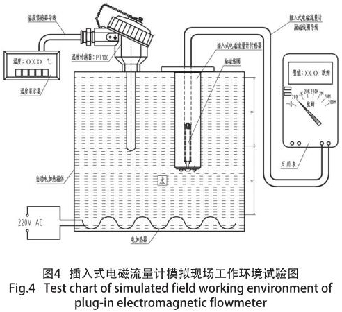 其原因是:勵(lì)磁線圈的阻值及匝數(shù)是按照常溫狀態(tài)下進(jìn)行設(shè)計(jì)的,而含有勵(lì)磁線圈的鹽酸流量表經(jīng)常是高于常溫狀態(tài)下進(jìn)行安裝、使用(如:高爐回水、供熱管道等),勵(lì)磁線圈的阻值隨使用環(huán)境溫度的變化而變化,致使鹽酸流量表測量時(shí)的準(zhǔn)確度大為降低,性能的不確定性大為增加,為了保證儀表的高準(zhǔn)確度和穩(wěn)定性,在不同的季節(jié)(主要是環(huán)境溫度和介質(zhì)溫度),經(jīng)過大量模擬現(xiàn)場實(shí)際情況的試驗(yàn),并結(jié)合轉(zhuǎn)換器的技術(shù)參數(shù)要求,得出一個(gè)完善的勵(lì)磁線圈各種技術(shù)參數(shù)。模擬現(xiàn)場試驗(yàn)裝置如圖 4 所示。