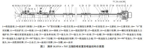 如圖 2 所示,DLFP14 - 70T 注脂防噴盒有 1 個注脂口、1 個回脂口、1 個防噴盒液控口、1 個刮纜器液控口及1 個溢流口,主體內(nèi)裝有 6 根阻流管。DLFP14 - 70T 注脂防噴盒采用 4 級密封: * 1 級密封采用注脂密封,撬裝注脂泵從注脂口注入高壓高粘度密封脂于 6 根阻流管與電纜間隙; * 2 級密封采用液壓密封,氣動液壓泵主加壓和手壓泵補(bǔ)加壓結(jié)合從防噴盒液控口注入液壓油,推動活塞擠壓膠芯壓筒; * 3 級密封采用液壓密封,手壓泵加壓從刮纜器液控口注入液壓油,推動活塞擠壓膠芯壓筒實(shí)現(xiàn)密封和刮油作用; * 4 級密封油杯、橡膠盤根和刮油環(huán)( 鋼 墊) 。DLFP14 - 70T 注脂防噴裝置配有液控上、下捕捉器、液控雙閘板防噴器和放噴組件,根據(jù)實(shí)際可以調(diào)整溢流量,實(shí)現(xiàn)零溢流密閉測井施工。 DLFP14 - 70T 注脂防噴裝置工作壓力 70 MPa,耐壓105 MPa。