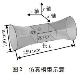 使用 Pro /E 軟件建立三維幾何模型,導(dǎo)入 COMSOL 軟件進(jìn)行有限元求解。仿真模型如圖 2 所示,電*連線為x 軸,連線中點(diǎn)為坐標(biāo)原點(diǎn),流體運(yùn)動(dòng)方向?yàn)?z 軸,傳感器管道口徑為 DN100,總長250 mm。異徑管部分初始結(jié)構(gòu)尺寸 L = 80 mm,D = 80 mm,H = 40 mm,圓形電*半徑為17 mm,伸出絕緣襯里的*大距離為 1. 5 mm。