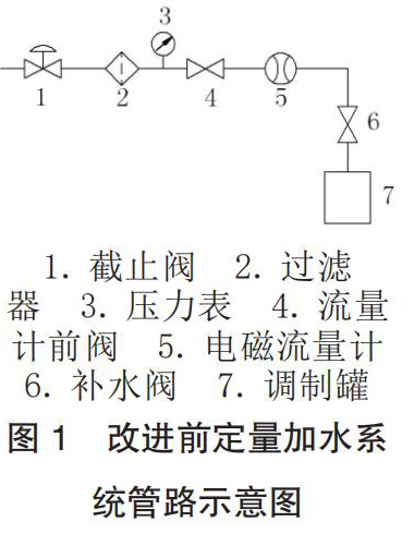 工廠的香料廚房系統(tǒng)為國內(nèi)煙機(jī)公司 2004 年設(shè)計(jì)制造,其定量加水系統(tǒng)主要由水源、智能法蘭式電磁流量計(jì)、加水管路元件和控制程序這四部分組成,改進(jìn)前管路示意圖如圖 1 所示。