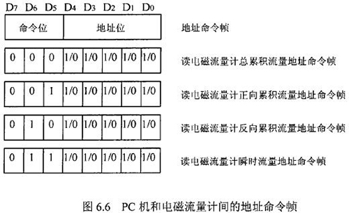 由于RS一485電氣標準規(guī)定每段只能聯(lián)結(jié)犯個節(jié)點設(shè)備,因此可用地址幀中五個二進制位表示這32個地址,其余3位用來表示命令,從而構(gòu)成地址命令幀。對于控制命令需求不超過八個的通信系統(tǒng),采用地址命令幀可壓縮報文長度提高通信效率。在污水網(wǎng)絡(luò)監(jiān)控系統(tǒng)中,紙漿流量計和PC機通信的主要目的是將流量計中的有用數(shù)據(jù)讀到PC機中。這些數(shù)據(jù)包括:總累積流量、正向累積流量、反向累積流量、瞬時流量。通信時,PC機只需向紙漿流量計發(fā)送讀總累積流量、讀正向累積流量、讀反向累積流量、讀瞬時流量命令即可,因此二者間通信所用的地址幀和命令幀可合二為一,用一個地址命令幀代替。PC機和紙漿流量計間的地址命令幀定義如圖.66所示。根據(jù)污水網(wǎng)絡(luò)監(jiān)控系統(tǒng)中PC機與紙漿流量計間通信的特殊性,二者通信所使用的報文可簡化為圖.67的格式。