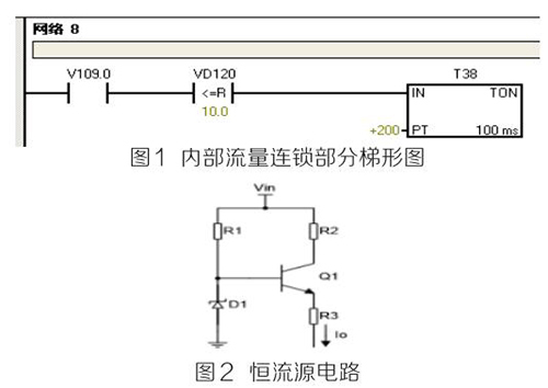 (2)PLC及模塊。PLC及模塊是自動(dòng)化控制系統(tǒng)主要設(shè)備,且PLC及模塊屬于高集成高精密電子設(shè)備,保持室內(nèi)整潔舒適,可以提高自動(dòng)化系統(tǒng)運(yùn)行穩(wěn)定性。PLC及模塊硬件運(yùn)行可靠,內(nèi)部控制程序是其控制核心軟件,如PLC硬件出現(xiàn)故障或損壞一般直接更換,但原內(nèi)部控制軟件無法上傳,整個(gè)控制系統(tǒng)成失控狀態(tài)。所以其內(nèi)部控制程序在調(diào)試驗(yàn)收合格后應(yīng)及時(shí)備份并做好標(biāo)記,為以后修復(fù)PLC故障提供保障。PLC系統(tǒng)的維護(hù)技術(shù)人員需掌握一定基礎(chǔ)PLC控制邏輯原理,對準(zhǔn)確判斷PLC故障點(diǎn)有很大的幫助。例如選礦廠水泵房S7-200系列PLC自動(dòng)抽水系統(tǒng)出現(xiàn)如下故障 :觸摸屏能控制變頻器啟動(dòng)水泵抽水,但在短時(shí)間內(nèi)會(huì)自動(dòng)停泵,導(dǎo)致無法正常抽水。通過故障現(xiàn)象可初步判斷PLC及模塊硬件設(shè)備正常,主要由于某個(gè)變量有問題導(dǎo)致連鎖停機(jī)。打開備份PLC控制梯形圖程序進(jìn)行相關(guān)分析,原來是氨水流量計(jì)瞬時(shí)流量數(shù)值做了連鎖,其在一定時(shí)間內(nèi)瞬時(shí)流量不大于10m 3 /h時(shí),自動(dòng)停泵,電磁流量模擬量輸出電流值僅為4ma且無變化,確定氨水流量計(jì)有故障??膳R時(shí)應(yīng)急維修,模擬量模塊輸入模擬電流值10ma~20ma之間一固定數(shù)值即可恢復(fù)正常運(yùn)行。制作簡單恒流源電路代替氨水流量計(jì)輸出的模擬電流量,實(shí)現(xiàn)解決水泵無法正常運(yùn)行的故障。
