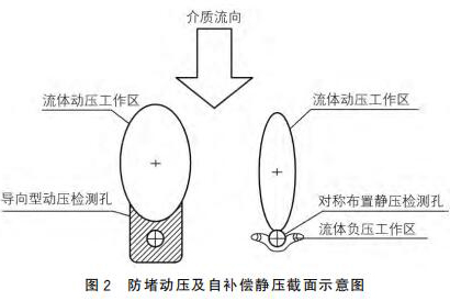 新濃鹽酸流量計(jì)采用拋物面導(dǎo)向型結(jié)構(gòu)作為動(dòng)壓測(cè)點(diǎn),采用對(duì)稱自補(bǔ)償型式的靜壓測(cè)點(diǎn),可以有效地解決來流方向偏流時(shí)信號(hào)的穩(wěn)定采集,來流偏離管道軸線時(shí),可以維持輸出差壓基本不變,如圖2所示。