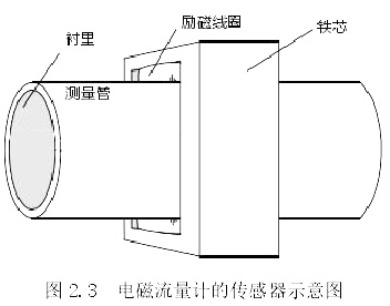 傳感器的主要作用是將通過管道的流量信號進(jìn)行轉(zhuǎn)換,將其轉(zhuǎn)為電動(dòng)勢。市面上常見的傳感器主要有下圖 2.4 中如測量管、鐵芯、勵(lì)磁線圈、襯里等結(jié)構(gòu)。