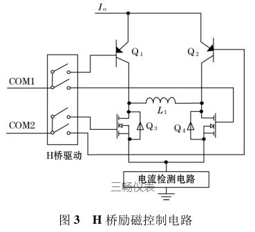 如圖2 所示,在對傳感器線圈進(jìn)行勵(lì)磁時(shí),通過比較器控制切換開關(guān)切換高低壓進(jìn)行勵(lì)磁。V ref 作為比較器的基準(zhǔn)輸入端,其表示勵(lì)磁電流的電壓穩(wěn)態(tài)值;而 C ur 則表示 H 橋勵(lì)磁電路中檢測到的電壓信號(hào)。一開始當(dāng)系統(tǒng)處于低壓勵(lì)磁狀態(tài)時(shí),系統(tǒng)會(huì)自動(dòng)斷開切換電路中的電流旁路,此時(shí)系統(tǒng)通過利用 H 橋向勵(lì)磁線圈提供恒定電流。當(dāng)勵(lì)磁方向變化時(shí),電流檢測電路就會(huì)檢測到電流變?yōu)樨?fù)方向,比較器的 C ur 端與V ref 端的平衡就會(huì)發(fā)生變化,此時(shí)系統(tǒng)通過比較器自動(dòng)切換為高壓勵(lì)磁狀態(tài)。與低壓勵(lì)磁方式相反,在此種狀態(tài)下,恒流控制電路關(guān)閉而電流旁路打開,線圈中的能量就會(huì)存儲(chǔ)在能量回饋電路中,此時(shí) C 1 端的電壓會(huì)超過高壓源。等勵(lì)磁線圈中的能量釋放完后,電流逐漸降為零,此時(shí)能量回饋電路就會(huì)利用電流旁路和 H 橋?qū)⒛芰糠答伣o勵(lì)磁線圈。當(dāng)電容 C 1 端的電壓下降到小于高壓源時(shí),系統(tǒng)就會(huì)自動(dòng)通過電流旁路和H 橋直接對勵(lì)磁線圈進(jìn)行勵(lì)磁,當(dāng)勵(lì)磁線圈中的電流超過設(shè)定閾值時(shí),C ur 端電壓就會(huì)大于 V ref 點(diǎn)電壓,此時(shí)比較器又會(huì)切換成低壓勵(lì)磁方式,如此反復(fù)循環(huán)控制,達(dá)到對勵(lì)磁線圈恒流控制的目的。圖 3 為 H 橋勵(lì)磁控制電路。