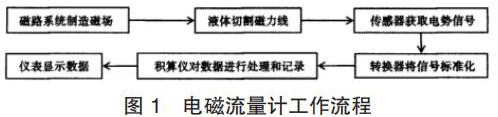 煤礦污水計量表的產(chǎn)生主要是基于法拉*電磁感應定律。在煤礦污水計量表的應用中,磁路系統(tǒng)會在流量計運行過程中逐步出現(xiàn)直流磁場與交流磁場,該磁場的產(chǎn)生為后期的測量提供了良好的前提條件,營造了測量所需的磁場環(huán)境,因此,在煤礦污水計量表應用時,一旦被測液體在導管中經(jīng)過該磁場環(huán)境時,必然會產(chǎn)生一定的切割磁力線運動,在這種情況下,電*傳感器就會發(fā)揮其作用,將導管內的流量轉換為感應電勢信號,隨后此轉換形成的信號逐步被傳遞給轉換器。而轉換器更是可以將所獲得的流量信號等加以處理,通過分析、對比等,轉換器會將該信號變?yōu)闃藴市盘?,隨后將該信號輸出給積算儀,進一步進行信號的處理,這些處理以后的信號*終會在煤礦污水計量表的儀表中顯示,呈現(xiàn)*終的流量測量結果,其基本的流程如圖 1 所示。