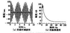 當(dāng)ω1-ω2趨近于0時(shí),即兩個(gè)信號的頻率越接近時(shí),拍振幅值越大。拍振信號的時(shí)域波形及頻譜圖如下,在頻譜圖中可看到兩個(gè)頻率接近的峰。