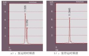 對振動(dòng)采集器獲取的信號進(jìn)行譜分析,海水流量計(jì)組運(yùn)轉(zhuǎn)狀態(tài)下主要振動(dòng)頻率為11.33Hz和12.38Hz,其中12.38Hz為海水流量計(jì)轉(zhuǎn)動(dòng)頻率;停運(yùn)時(shí),12.38Hz的海水流量計(jì)轉(zhuǎn)頻消失,11.33Hz的外部激擾力依然存在。