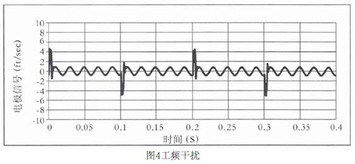 工頻干擾是給排水流量計常見的干擾源。當(dāng)流量計處于電源形成電磁場中時,由于分布電容的存在,以電磁波的輻射形式干擾電*信號,或者是由供電電源引入的工頻串?dāng)_,工作現(xiàn)場的工頻共模干擾,其產(chǎn)生的物理機理均是電磁感應(yīng)原理。幅度與流量信號相比,往往要大幾個數(shù)量級,頻率與供電電源頻率相同。如圖4所示,線圈驅(qū)動頻率為5Hz的電*信號,被耦合了50Hz的工頻干擾,幅度大概相當(dāng)于1feet/s。