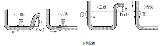 ⑴為了避免由夾附氣體引起的測量誤差,請觀察如下安裝方法:見圖-1,錯(cuò)誤安裝—裝在管線走向*高點(diǎn)(在測量中容易聚集空氣泡)。
