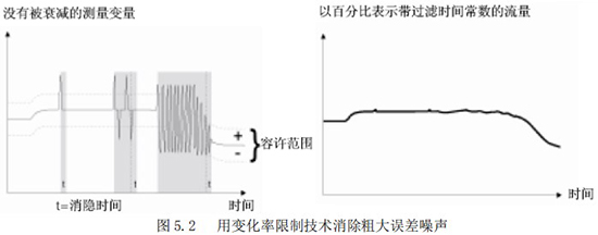 “變化率限制值”與“不敏感時(shí)間值”是用來消除某些增加阻尼不能除去的噪聲。它能夠從真實(shí)的流量信號(hào)中判別出階躍信號(hào)引起的噪聲和漿液尖狀噪聲。這種判別是以變化率的限制和持續(xù)時(shí)間為依據(jù)的。圖 5.2 所示為使用變化率限制技術(shù)去除粗大誤差的原理說明。該功能為在前面采樣中獲得的流量數(shù)據(jù)經(jīng)一階濾波后的,設(shè)定某一上限和下限(變化率)。如果當(dāng)前采樣的流量數(shù)據(jù)超過或低于這個(gè)*限值,而且在超過或低于這個(gè)*限值的變化時(shí)間之內(nèi),則認(rèn)為這種變化是由于噪聲所引起的,CPU 予以切除;而當(dāng)超過或低于這個(gè)*限值的變化在設(shè)置的不敏感時(shí)間以外,則認(rèn)為這種變化是由于真正的流量變化所引起,CPU 就認(rèn)可是測量流量的變化。