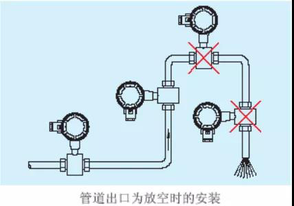 當(dāng)出口為放空狀態(tài)時,傳感器不應(yīng)安裝在管道放空之處,應(yīng)安裝在較低處。傳感器安裝在管道下方處時,應(yīng)保證傳感器內(nèi)被液體充滿,不能出現(xiàn)空管狀態(tài)。