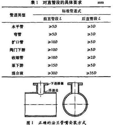 流體在方向、管徑以及閥門開(kāi)度變化時(shí),會(huì)產(chǎn)生渦流和流場(chǎng)畸變,這樣會(huì)對(duì)傳感器電*的測(cè)量產(chǎn)生影響,從而影響儀表的精度。所以要盡可能地離開(kāi)彎管、手閥、調(diào)節(jié)閥等部件一定距離,直管段的具體要求見(jiàn)表1。表中,D表示管道通徑,L表示傳感器到閥門或彎頭等部件的距離。