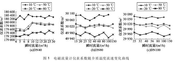 將實(shí)驗(yàn)測得的粘土漿流量計(jì)在不同溫度及流速下的儀表系數(shù)數(shù)據(jù)整理,特性曲線如圖1所示,3組曲線分別對應(yīng)DN40、DN80、DN100的3塊粘土漿流量計(jì)的儀表系數(shù)曲線。