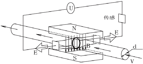 如圖,測(cè)量流量時(shí),流體流過(guò)垂直于流動(dòng)方向的磁場(chǎng),導(dǎo)電性流體的流動(dòng)感應(yīng)出一個(gè)與平均流速成正比的電勢(shì)。其感應(yīng)電壓信號(hào)通過(guò)兩個(gè)電*檢出,并通過(guò)電纜傳送至轉(zhuǎn)換器,經(jīng)過(guò)信號(hào)處理及相關(guān)運(yùn)算后,將累計(jì)流量和瞬時(shí)流量顯示在轉(zhuǎn)換器的顯示屏上。