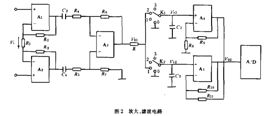 從圖2中可以看出,由Al,A2,A3。所組成的放大電路為一個(gè)典型的高輸入阻抗的雙端輸入、單端輸出的交流放大電路。由A4,A5所組成的放大電路為一個(gè)高輸入阻抗的雙端輸入、單端輸出的直流放大電路。K1,K2采用模擬開(kāi)關(guān)CD4052。這是一個(gè)雙路四通道的模擬開(kāi)關(guān)。電路中的兩個(gè)開(kāi)關(guān)是同步的。R是濾波電阻,C1,C2是兩只容量相同的濾波電容。