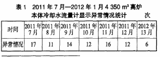 本體流量計工作平臺的煤氣濃度(全文中“煤氣濃度”均指“質(zhì)量分數(shù)”)*小為900×10-6,一般情況為1100×10-6~1 200×10-6,*高時可達1800×10-6,而實際工作時的安全工作范圍是低于160×10-6。如此大的煤氣濃度的工作平臺使得在處理故障的過程中存在較大的安全隱患。表1是對2011年7月—2012年1月4 350m³高爐本體冷卻水流量計顯示異常情況進行的統(tǒng)計。