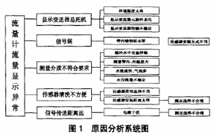 通過頭腦風暴法對流量計顯示異常原因進行查找,繪制系統(tǒng)圖(見圖1)來進行原因分析。