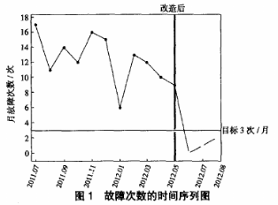 通過實施改進措施之后,繪制2011年7月—2012年8月本體流量計故障次數(shù)時間序列圖(圖3)。圖3中圓點表示改造前故障次數(shù),三角形表示改造之后故障次數(shù)。由圖3可以看出,改造前故障次數(shù)全部在控制限以外;改造之后故障次數(shù)全部在控制限內(nèi),均已達到3次/月的控制目標。