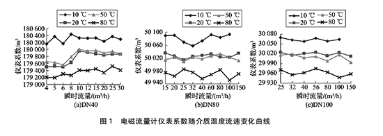 將實(shí)驗(yàn)測得的pvc排水管流量計在不同溫度及流速下的儀表系數(shù)數(shù)據(jù)整理,特性曲線如圖1所示,3組曲線分別對應(yīng)DN40, DN80, DN100的3塊pvc排水管流量計的儀表系數(shù)曲線。